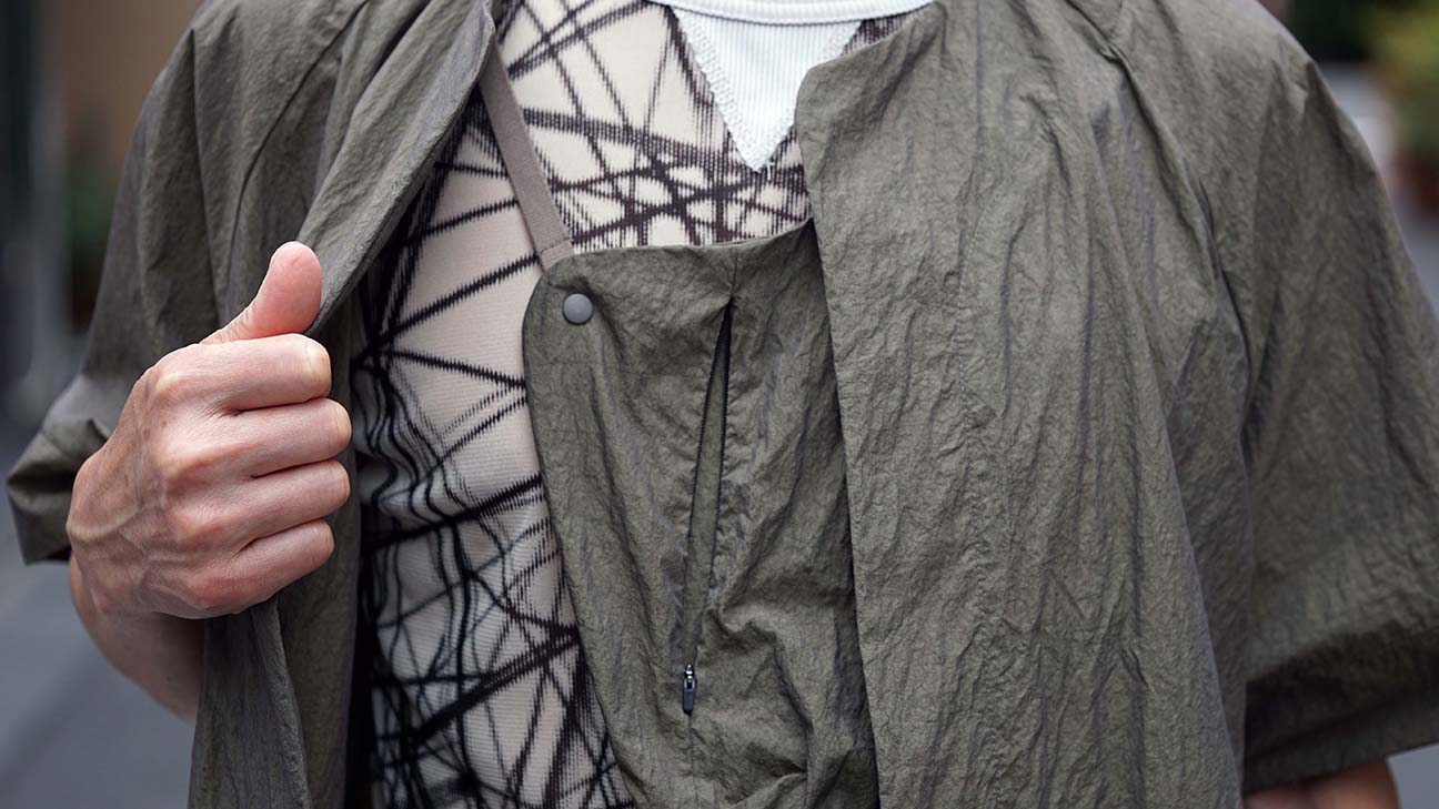 さぁCCP2025SSのこの後上がるアイテムもあと6型程。では今迄の2025SSアイテムをハイライトで見て行きましょう。 JK-NB101 / AZATOGE このコレクションの顔とも言えるデザインのジャケット。インパクト大のダブルの止水ファスナーと、背中の大胆なベンチレーション、そして太い巾の裾リブ。TEIJINの "MINOTECH®"という防風透湿撥水素材の中でも更に最新の未発表素材...